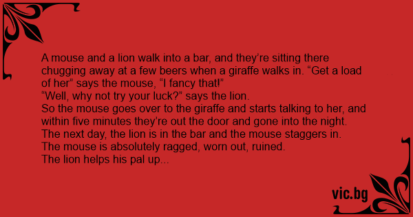 A mouse and a lion walk into a bar, and they’re sitting there chugging away at a few beers when a giraffe walks in. “Get a load of her” says the mouse, “I fancy that!”