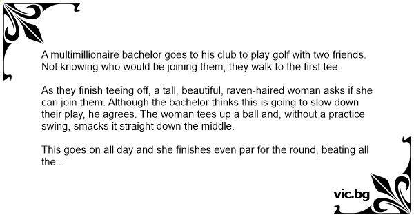 As they finish teeing off, a tall, beautiful, raven-haired woman asks if she can join them. Although the bachelor thinks this is going to slow down their play, he agrees. The woman tees up a ball and, without a practice swing, smacks it straight down the middle.