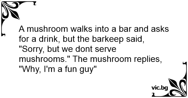 "Sorry, but we dont serve mushrooms." The mushroom replies, "Why, I'm a fun guy"
