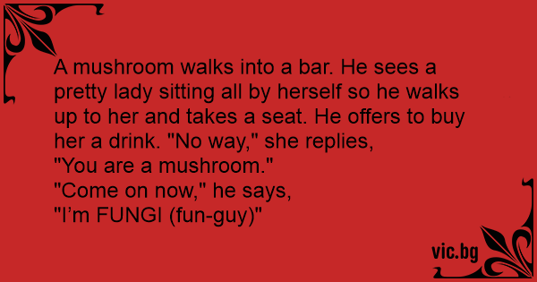 A mushroom walks into a bar. He sees a pretty lady sitting all by herself so he walks up to her and takes a seat. He offers to buy her a drink. "No way," she replies,
