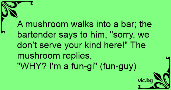 A mushroom walks into a bar; the bartender says to him, "sorry, we don’t serve your kind here!" The mushroom replies,