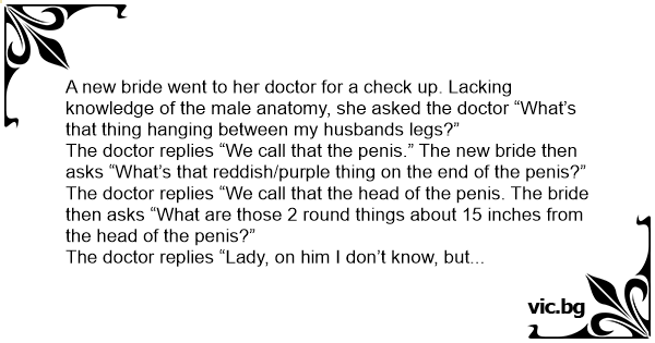 The doctor replies “We call that the head of the реnis. The bride then asks “What are those 2 round things about 15 inches from the head of the реnis?”
