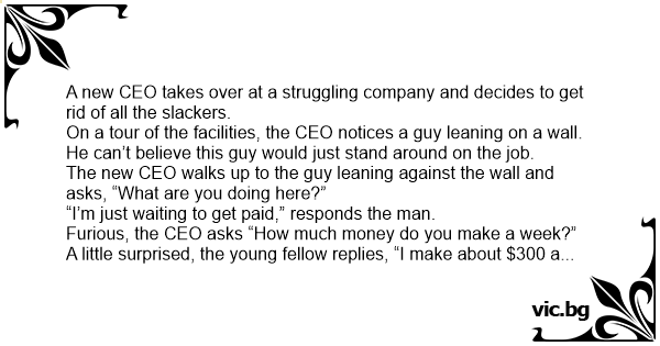 The new CEO walks up to the guy leaning against the wall and asks, “What are you doing here?”