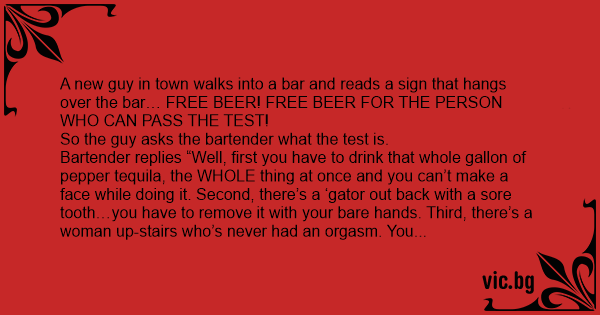 A new guy in town walks into a bar and reads a sign that hangs over the bar… FREE ВЕЕR! FREE ВЕЕR FOR THE PERSON WHO CAN PASS THE TEST!