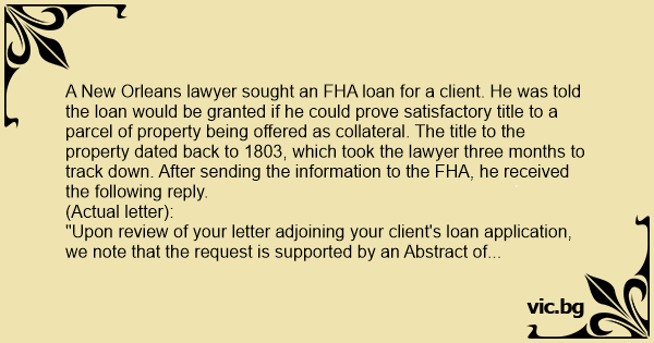 A New Orleans lawyer sought an FHA loan for a client. He was told the loan would be granted if he could prove satisfactory title to a parcel of property being offered as collateral. The title to the property dated back to 1803, which took the lawyer three months to track down. After sending the information to the FHA, he received the following reply.