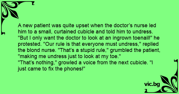 A new patient was quite upset when the doctor’s nurse led him to a small, curtained cubicle and told him to undress. "But I only want the doctor to look at an ingrown toenail!" he protested. "Our rule is that everyone must undress," replied the blond nurse. "That’s a sтuрid rule," grumbled the patient, "making me undress just to look at my toe."