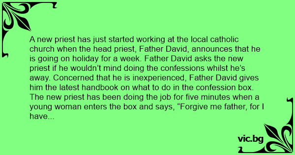 A new priest has just started working at the local catholic church when the head priest, Father David, announces that he is going on holiday for a week. Father David asks the new priest if he wouldn’t mind doing the confessions whilst he’s away. Concerned that he is inexperienced, Father David gives him the latest handbook on what to do in the confession box.