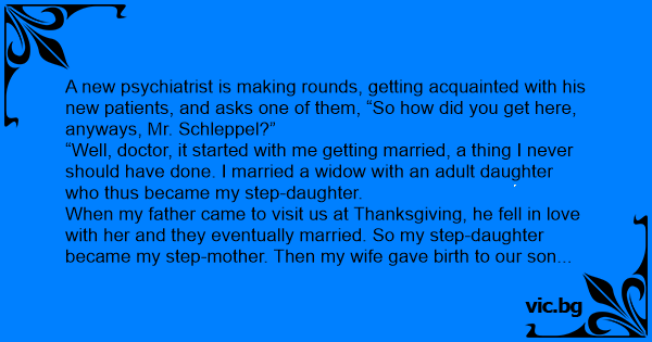 A new psychiatrist is making rounds, getting acquainted with his new patients, and asks one of them, “So how did you get here, anyways, Mr. Schleppel?”