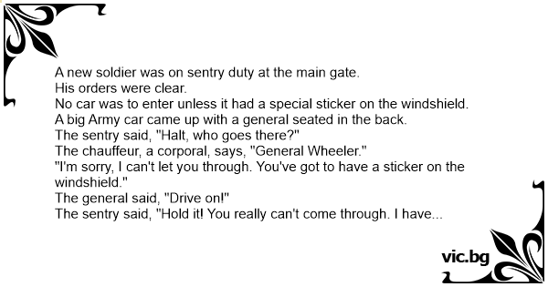 The sentry said, "Hold it! You really can't come through. I have orders to shoot if you try driving in without a sticker."