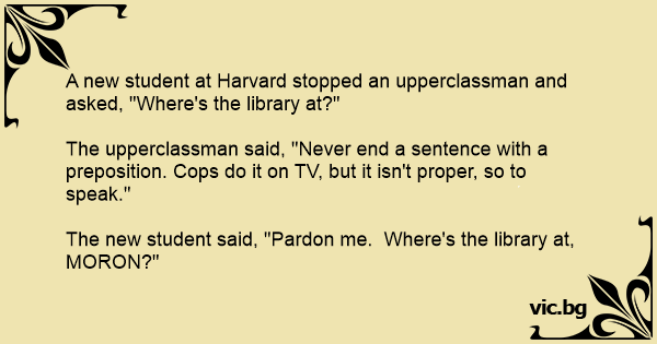 A new student at Harvard stopped an upperclassman and asked, "Where's the library at?"