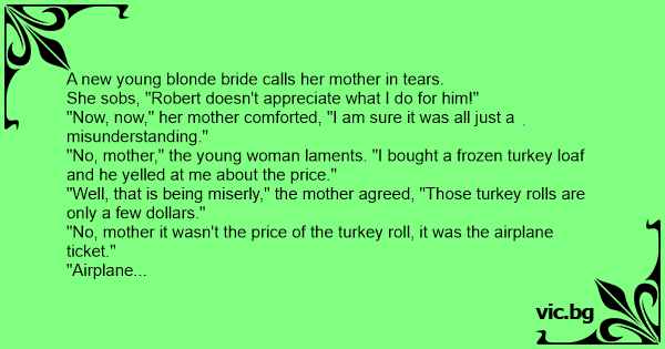 "No, mother," the young woman laments. "I bought a frozen turkey loaf and he yelled at me about the price."