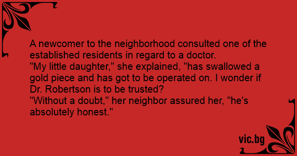"My little daughter," she explained, "has swallowed a gold piece and has got to be operated on. I wonder if Dr. Robertson is to be trusted?