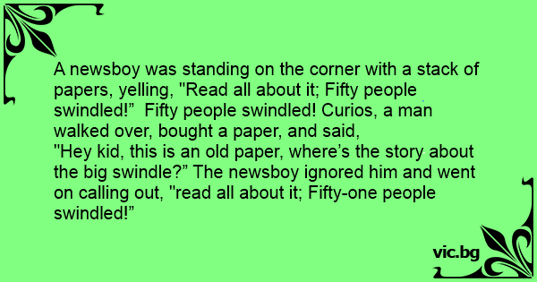 A newsboy was standing on the corner with a stack of papers, yelling, "Read all about it; Fifty people swindled!” Fifty people swindled! Curios, a man walked over, bought a paper, and said,