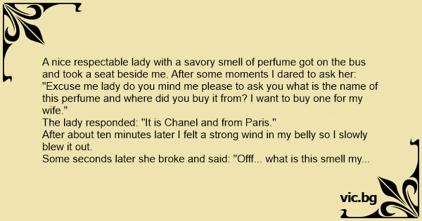 A nice respectable lady with a savory smell of perfume got on the bus and took a seat beside me. After some moments I dared to ask her: