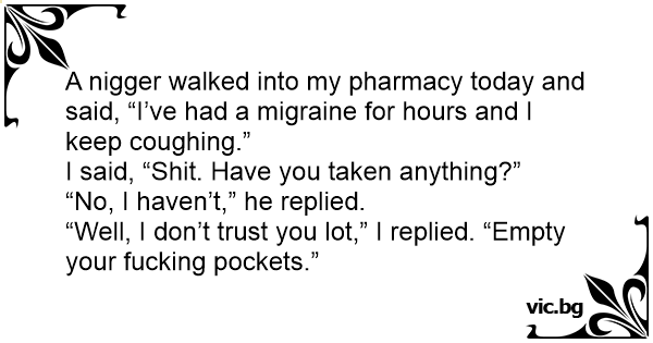 A niggеr walked into my pharmacy today and said, “I’ve had a migraine for hours and I keep coughing.”