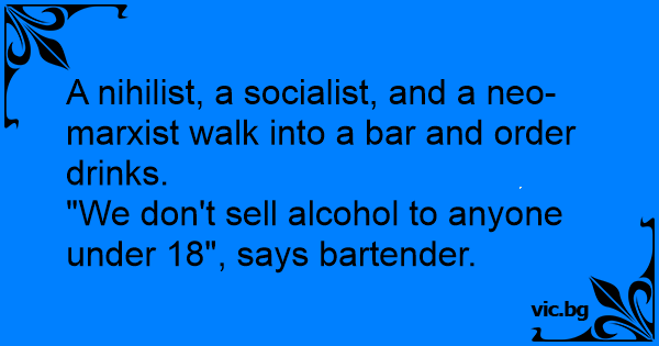 A nihilist, a socialist, and a neo-marxist walk into a bar and order drinks.<br />"We don't sell alcohol to anyone under 18", says bartender.