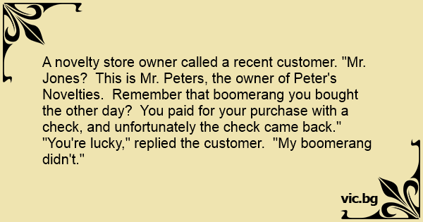 A novelty store owner called a recent customer. "Mr. Jones? This is Mr. Peters, the owner of Peter's Novelties. Remember that boomerang you bought the other day? You paid for your purchase with a check, and unfortunately the check came back."