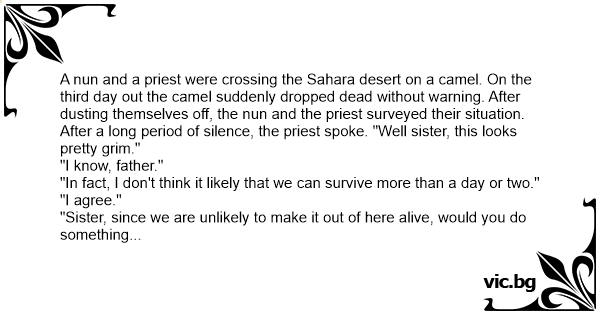 A nun and a priest were crossing the Sahara desert on a camel. On the third day out the camel suddenly dropped dead without warning. After dusting themselves off, the nun and the priest surveyed their situation. After a long period of silence, the priest spoke. "Well sister, this looks pretty grim."
