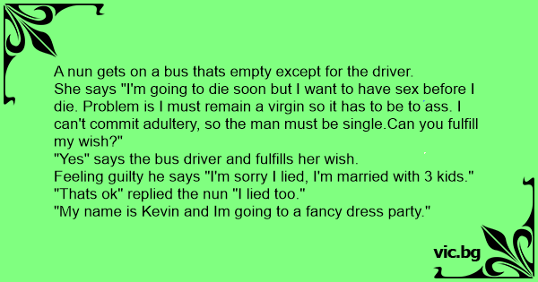 En nunna åker buss, och säger till chauffören: - Jag är dödligt sjuk, och har aldrig haft sex, jag vill inte dö nyfiken. Jag skulle vilja ha sex med dig, men bara om du inte är gift. - Jag är inte gift, ljuger chauffören. - Men jag måste dö oskuld,...