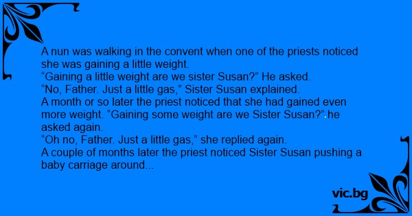 A month or so later the priest noticed that she had gained even more weight. “Gaining some weight are we Sister Susan?” he asked again.
