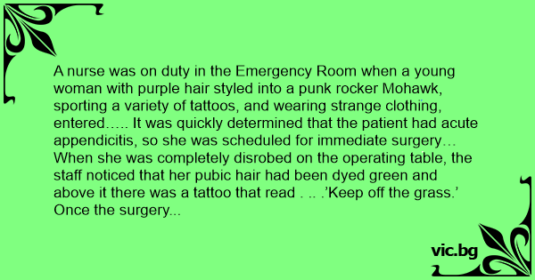 A nurse was on duty in the Emergency Room when a young woman with purple hair styled into a punk rocker Mohawk, sporting a variety of tattoos, and wearing strange clothing, entered….. It was quickly determined that the patient had acute appendicitis, so she was scheduled for immediate surgery… When she was completely disrobed on the operating table, the staff noticed that her рuвiс hair had been dyed green and above it there was a tattoo that read . .. .’Keep off the grass.’