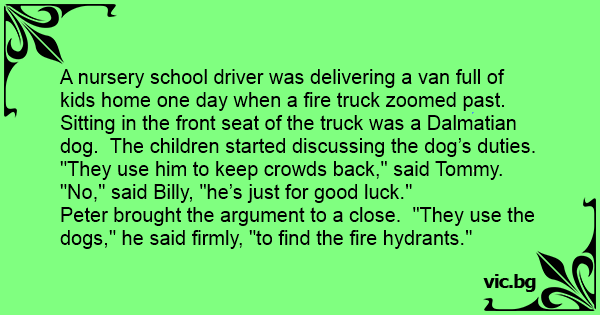 A nursery school driver was delivering a van full of kids home one day when a fire truck zoomed past. Sitting in the front seat of the truck was a Dalmatian dog. The children started discussing the dog’s duties.