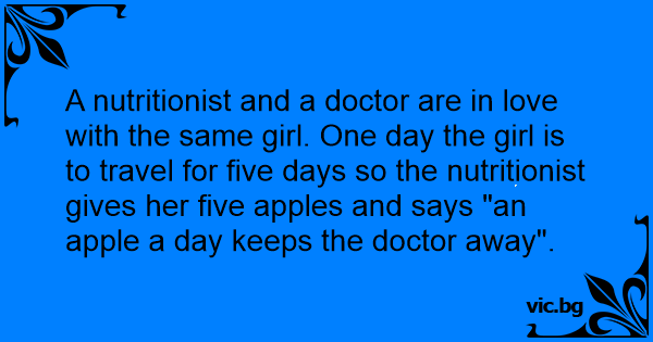 A nutritionist and a doctor are in love with the same girl. One day the girl is to travel for five days so the nutritionist gives her five apples and says "an apple a day keeps the doctor away".