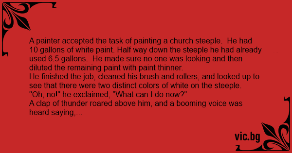 A painter accepted the task of painting a church steeple. He had 10 gallons of white paint. Half way down the steeple he had already used 6.5 gallons. He made sure no one was looking and then diluted the remaining paint with paint thinner.