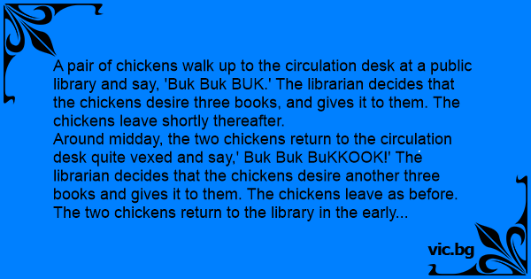 A pair of chickens walk up to the circulation desk at a public library and say, 'Buk Buk BUK.' The librarian decides that the chickens desire three books, and gives it to them. The chickens leave shortly thereafter.