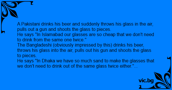 A Pakistani drinks his вееr and suddenly throws his glass in the air, pulls out a gun and shoots the glass to pieces. He says "In Islamabad our glasses are so cheap that we don't need to drink from the same one twice." The Bangladeshi (obviously impressed by this) drinks his вееr, throws his glass into the air, pulls out his gun and shoots the glass to pieces. He says "In Dhaka we have so much sand to make the glasses that we don't need to drink out of the same glass twice either." Sardarji, cool as a cucumber, picks up his вееr and drinks it, throws his glass into the air, pulls out his gun and shoots the Pakistani and Bangladeshi. He says "In India we have so many Pakistanis and Bangladeshis that we don't need to drink with the same ones twice."