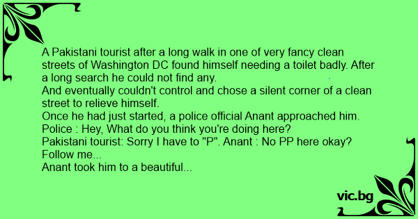 A Pakistani tourist after a long walk in one of very fancy clean streets of Washington DC found himself needing a toilet badly. After a long search he could not find any.