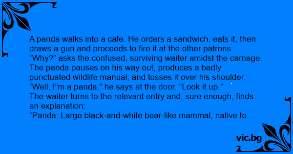 A panda walks into a cafe. He orders a sandwich, eats it, then draws a gun and proceeds to fire it at the other patrons.
