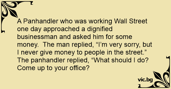 A Panhandler who was working Wall Street one day approached a dignified businessman and asked him for some money. The man replied, “I’m very sorry, but I never give money to people in the street.”