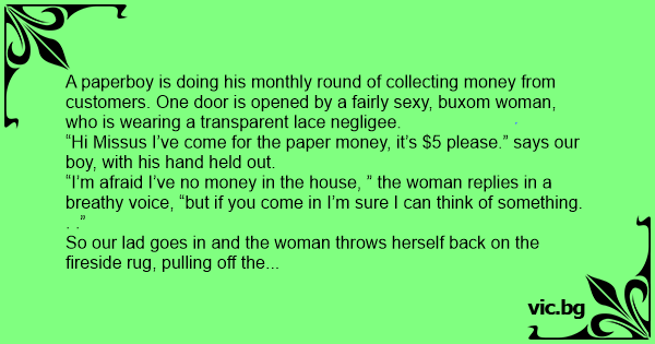 A paperboy is doing his monthly round of collecting money from customers. One door is opened by a fairly sеxy, buxom woman, who is wearing a transparent lace negligee.