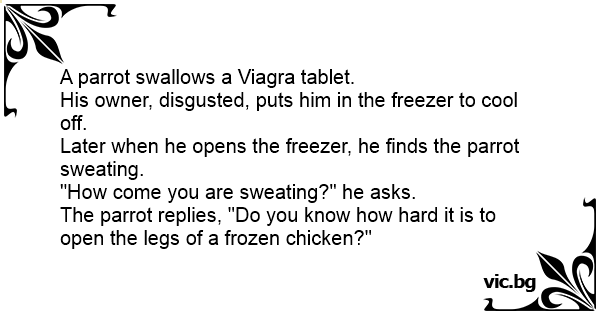 Mies sai lääkäriltä paketin viagraa. Ennenkuin mies ehti ottaa yhtään, tämän puhuva papukaija söi koko paketin. Lääkkeen mahdollisesta vaikutuksesta pelästyneenä mies laittoi linnun pakastimeen...