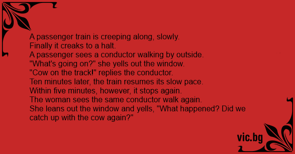 She leans out the window and yells, "What happened? Did we catch up with the соw again?"