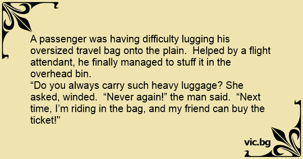 “Do you always carry such heavy luggage? She asked, winded. “Never again!” the man said. “Next time, I’m riding in the bag, and my friend can buy the ticket!"