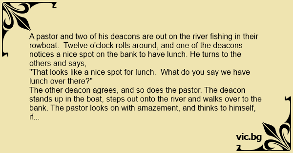 The other deacon agrees, and so does the pastor. The deacon stands up in the boat, steps out onto the river and walks over to the bank. The pastor looks on with amazement, and thinks to himself, if his deacon is holy enough to walk on water, surely he can.