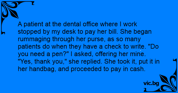 A patient at the dental office where I work stopped by my desk to pay her bill. She began rummaging through her purse, as so many patients do when they have a check to write. "Do you need a pen?" I asked, offering her mine.