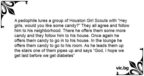 A реdорhilе lures a group of Houston Girl Scouts with “Hey girls, would you like some candy?” They all agree and follow him to his neighborhood. There he offers them some more candy and they follow him to his house. Once again he offers them candy to go in to his house. In the lounge he offers them candy to go to his room. As he leads them up the stairs one of them pipes up and says “God, I hope we get laid before we get diabetes”