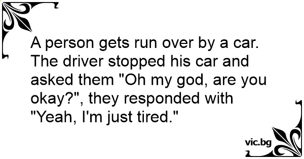 A person gets run over by a car. The driver stopped his car and asked them "Oh my god, are you okay?", they responded with "Yeah, I'm just tired."