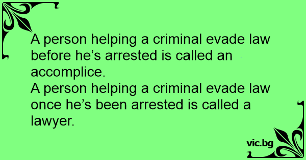 - Как называется лицо, помогающее преступнику до того, как он совершил преступление? - Сообщник. - А если оно помогает преступнику после того, как он совершил преступление? - Адвокат.