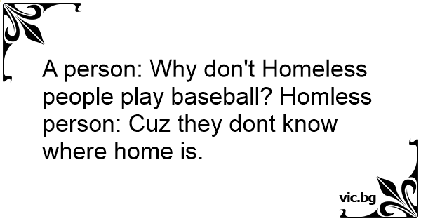A person: Why don't Homeless people play baseball? Homless person: Cuz they dont know where home is.