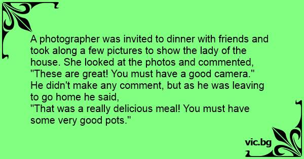 A photographer was invited to dinner with friends and took along a few pictures to show the lady of the house. She looked at the photos and commented, "These are great! You must have a good camera."