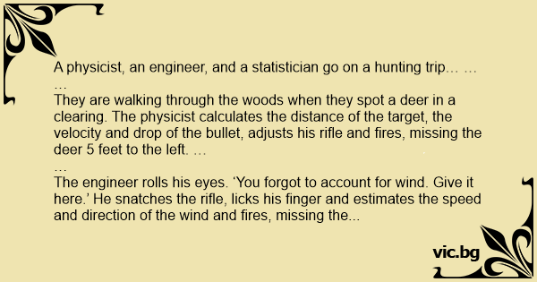 They are walking through the woods when they spot a deer in a clearing. The physicist calculates the distance of the target, the velocity and drop of the bullet, adjusts his rifle and fires, missing the deer 5 feet to the left. …