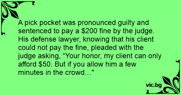 A pick pocket was pronounced guilty and sentenced to pay a $200 fine by the judge. His defense lawyer, knowing that his client could not pay the fine, pleaded with the judge asking, “Your honor, my client can only afford $50. But if you allow him a few minutes in the crowd…"
