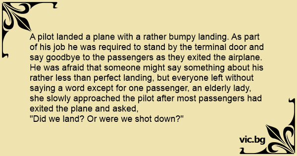A pilot landed a plane with a rather bumpy landing. As part of his job he was required to stand by the terminal door and say goodbye to the passengers as they exited the airplane. He was afraid that someone might say something about his rather less than perfect landing, but everyone left without saying a word except for one passenger, an elderly lady, she slowly approached the pilot after most passengers had exited the plane and asked,