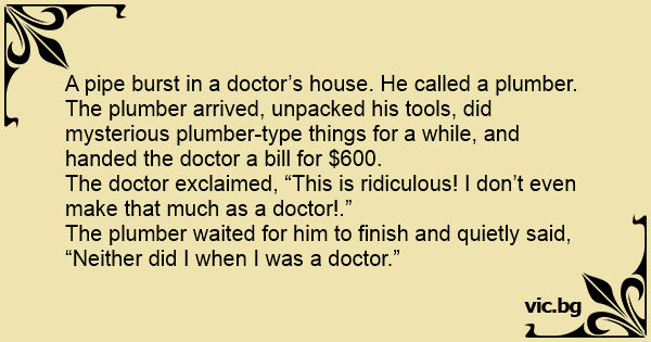 The plumber waited for him to finish and quietly said, “Neither did I when I was a doctor.”