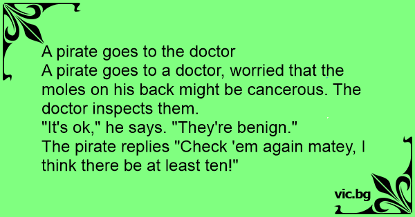 A pirate goes to a doctor, worried that the moles on his back might be cancerous. The doctor inspects them.