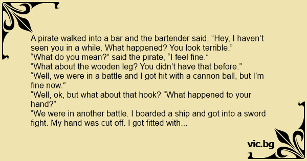 A pirate walked into a bar and the bartender said, “Hey, I haven’t seen you in a while. What happened? You look terrible.”